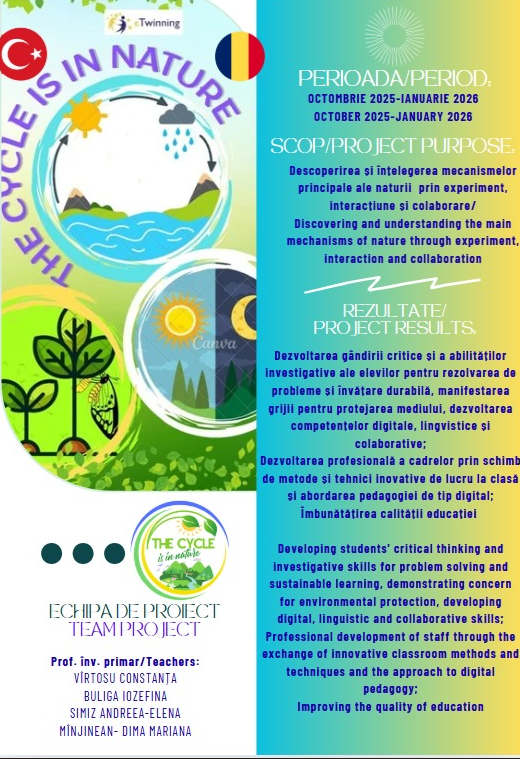 - THE CYCLE IS IN NATURE –profesor învățământ primar Vîrtosu Constanța, profesor învățământ primar Simiz Andreea, profesor învățământ primar Buliga Iozefina, profesor învățământ primar Mînjineanu-Dima Mariana